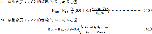 齒間載荷分配系數(shù)是考慮幾對(duì)同時(shí)嚙合的輪齒之間的載荷分配不均勻的影響。其值按下述方法確定7):(7)式(40和式(41)基于這樣假定,即符合規(guī)定的齒輪精度的基節(jié)偏差,且是沿小輪和大輪的圓周正常分布。當(dāng)輪齒具有某種故意的偏差時(shí),它們是不適用于的。)
