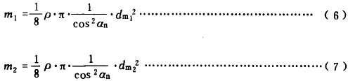 在設(shè)計(jì)階級(jí),精確確定小、大錐齒輪的當(dāng)量質(zhì)量m1及m2是困難的。對(duì)常見的錐齒輪結(jié)構(gòu)。可近似地以動(dòng)力當(dāng)量圓柱齒輪(見圖2)質(zhì)量來代替。于是,m1和m2可按公式(6)、(7)計(jì)算。