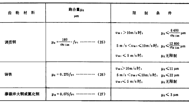 跑合量yα定義為通過跑合使運(yùn)轉(zhuǎn)之初的嚙合齒距誤差減小的量。如無實(shí)測(cè)數(shù)據(jù)時(shí),可由表7各式計(jì)算或由圖3、圖4查取。