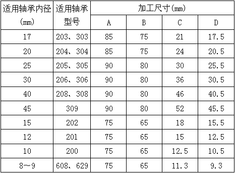 (表1)軸承沖筒加工尺寸表 小結(jié):滾動(dòng)軸承是比較精密的部件,只有正確安裝,才能保證使用壽命。本文介紹的軸承沖筒加工簡(jiǎn)單、使用方便,可提高工作效率數(shù)倍,不僅適合電動(dòng)機(jī)用滾動(dòng)軸承的安裝,也適合其他設(shè)備用滾動(dòng)軸承的安裝。望同行朋友試用,并提出寶貴的意見。 |