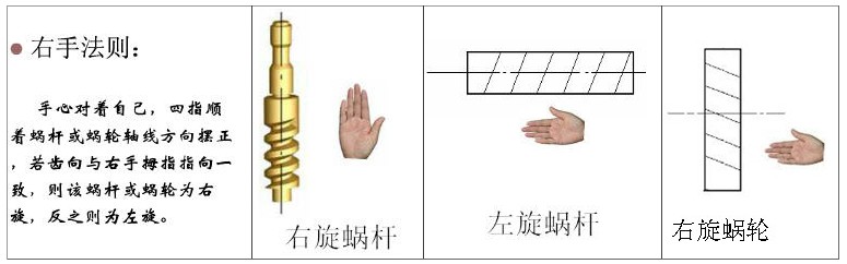 蝸輪蝸桿旋向是蝸輪蝸桿傳動的基本參數(shù),分左旋和右旋,主要區(qū)別在于蝸輪蝸桿的旋轉(zhuǎn)方向,其中右旋蝸桿最為常見,一副蝸輪蝸桿旋向的判斷方法可根據(jù)右手法則確認(rèn):