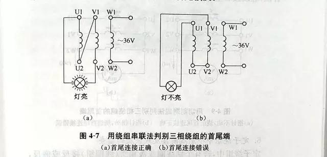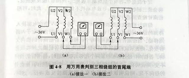 將三相繞組接成星形,從一相繞組接入36V交流電源,在另外兩相繞組的一端接入置于10V交流電壓擋的萬(wàn)用表,按圖4-8(a)和(b)所示各接一次。 通電后,觀察萬(wàn)用表指針的擺動(dòng)情況。若兩次萬(wàn)用表指針均不動(dòng),則說(shuō)明圖中所示的首尾端正確;若兩次萬(wàn)用表指針都偏轉(zhuǎn),則說(shuō)明兩次均未接電源的那一相的首尾接反 ;若只有一次指針偏轉(zhuǎn),另一次指針不動(dòng),則說(shuō)明指針不動(dòng)的那一次中接電源的那一相首尾接反。