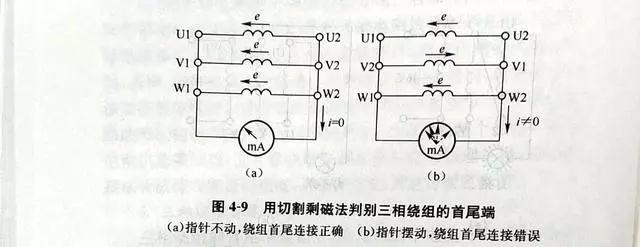 切割剩磁法是利用轉(zhuǎn)子鐵心中的剩磁在定子三相繞組中感應(yīng)出電動(dòng)勢(shì),用萬(wàn)用表指示出其回路中的電流值來(lái)檢查的。接線如圖4-9所示,用萬(wàn)用表(毫安擋)進(jìn)行測(cè)量。測(cè)量時(shí)用手轉(zhuǎn)動(dòng)電動(dòng)機(jī)的轉(zhuǎn)子,如果萬(wàn)用表的指針不動(dòng),則說(shuō)明三相繞組首尾連接是正確的。即三相繞組的首端與首端連接、尾端與尾端連接。如果萬(wàn)用表的指針來(lái)回?cái)[動(dòng),則說(shuō)明三相繞組連接有誤,應(yīng)改接后重試。