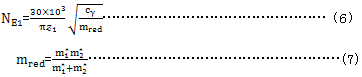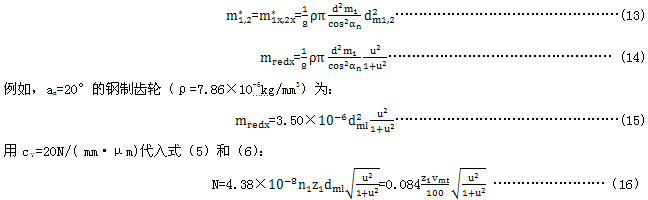 a用于εvγ,見(jiàn)式(A·39)。 b齒矩偏差的影響系數(shù),假定為常數(shù)。 c齒廓偏差的影響系數(shù)。 d嚙合剛度周期變化量的影響系數(shù)。 e考慮由嚙合剛度的周期變化量所激勵(lì)的扭振的影響系數(shù)。 f在超臨界區(qū),cv5與cv6影響系數(shù)KV-B的影響對(duì)應(yīng)亞臨界區(qū)cv1與cv2的影響。 g本影響系數(shù)考慮由于嚙合剛度的變化量而產(chǎn)生的作用力的一個(gè)分量(這個(gè)作用力的分量是在基本恒速下由輪齒彎曲變形引起的)。 |