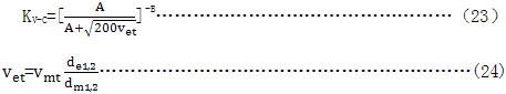 由曲線6~9與精密齒輪傳動(dòng)(7.7.4.2)選擇KV-C 是基于傳動(dòng)誤差(見(jiàn)7.4)基礎(chǔ)之上的。如果不能獲得傳動(dòng)誤差,則評(píng)價(jià)齒面上的接觸斑點(diǎn)也是合理的。如果每側(cè)齒面的接觸斑點(diǎn)不一致,則齒距精度(齒距偏差)作為精度的代表數(shù)值,以確定動(dòng)載系數(shù)。C是精度等級(jí)系數(shù),按GB/T10095.1給出的計(jì)算式計(jì)算。