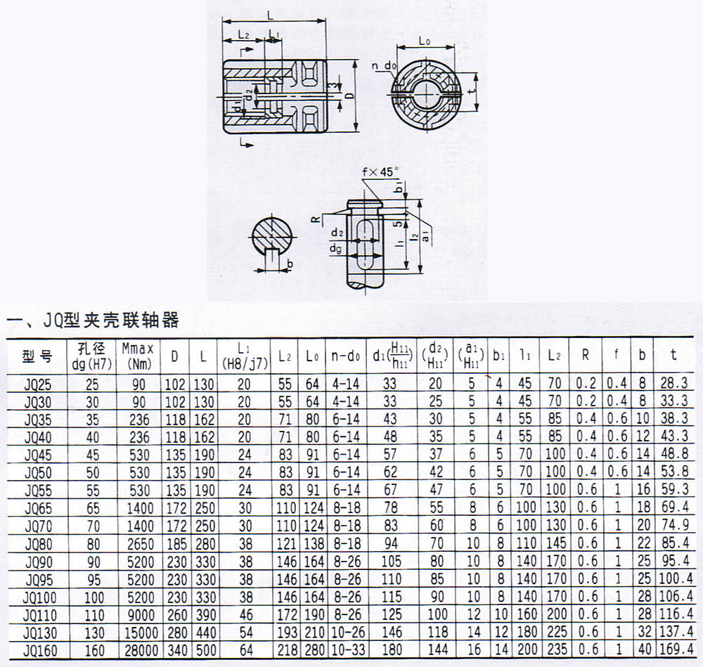 JQ型夾殼聯(lián)軸器外形尺寸參數(shù),JQ型夾殼聯(lián)軸器適用于立式擺線針輪減速機架I型軸頭與反應(yīng)器攪拌軸頭的聯(lián)接.