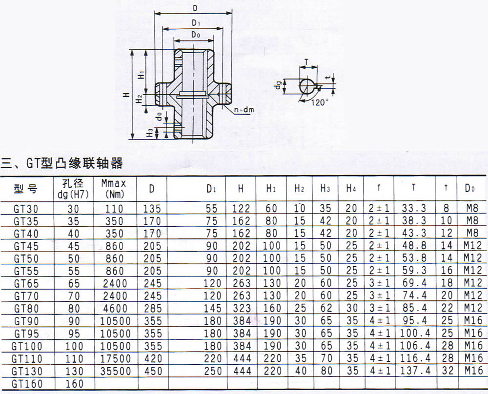 GT型凸緣聯(lián)軸器外形尺寸,GT型凸緣聯(lián)軸器適用于II型減速機軸頭與反應(yīng)器攪拌軸頭的聯(lián)接.GT型聯(lián)軸器堅定螺釘d0與鍵槽的位置的夾角為順時針方向120度.