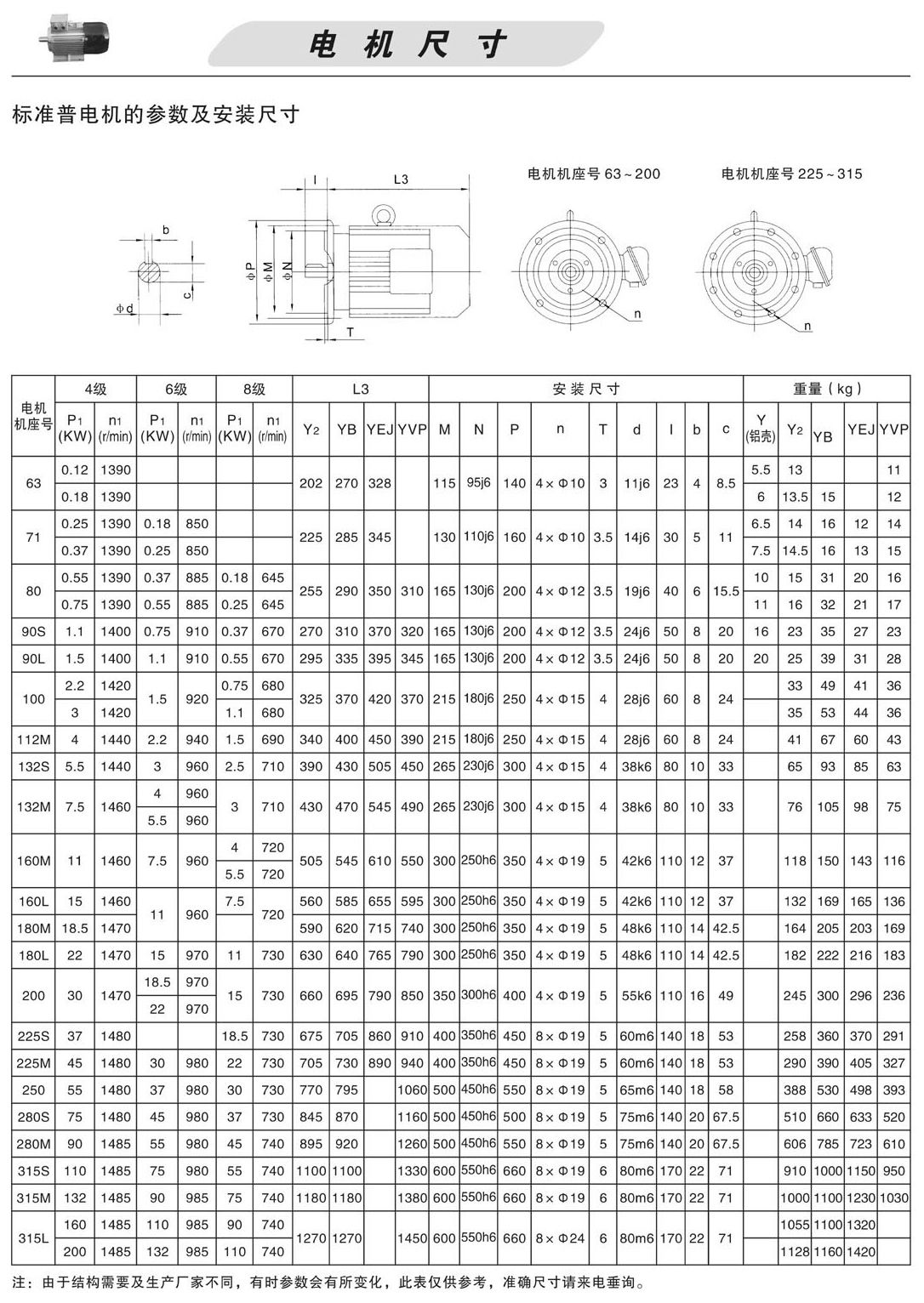 標準普電機的參數(shù)及安裝尺寸,包括立式電機的常用類型(Y2,YEJ,YVP,YB)的四級,六級,八級所對應的長度,重量.非標電機尺寸需要另外注明: