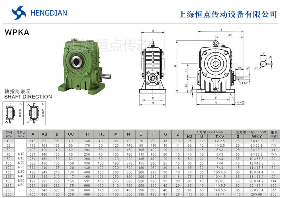 WPKA系列蝸輪蝸桿減速機(jī)的外形尺寸及安裝尺寸.機(jī)座號從40到250,可選速比從10到60.WPKA減速機(jī)軸輸入,孔輸出.WPA系列蝸輪蝸桿減速機(jī)選型指南,選型方法,WPKA減速機(jī)軸指向表示方法