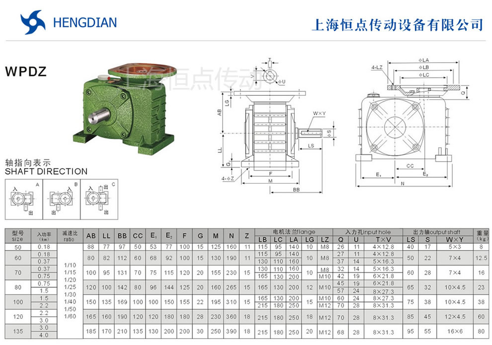 WPDZ減速機法蘭輸入,軸輸出.WPDZ減速機軸指向表示方法.機座號從50到135,可選速比從10到60.WPDZ系列蝸輪蝸桿減速機選型指南,WPDZ蝸輪蝸桿減速機的外形尺寸及安裝尺寸,