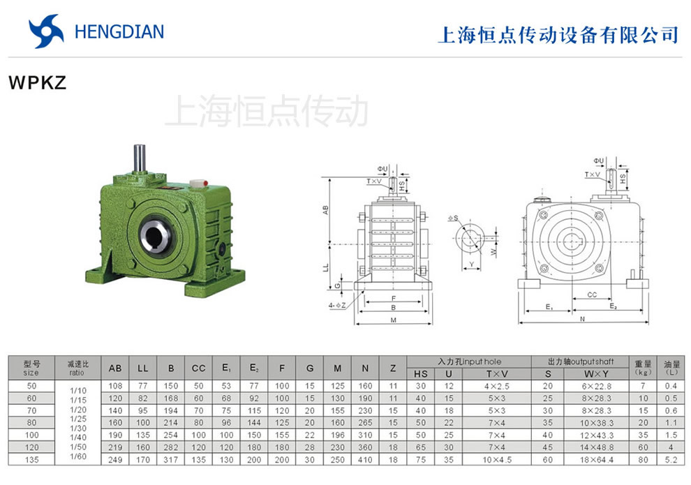 WPKZ系列蝸輪蝸桿減速機(jī)選型指南.WPKZ蝸輪蝸桿減速機(jī)的外形尺寸及安裝尺寸,WPKZ減速機(jī)法蘭輸入,軸輸出.WPKZ減速機(jī)軸指向表示方法.機(jī)座號(hào)從50到135,可選速比從10到60.