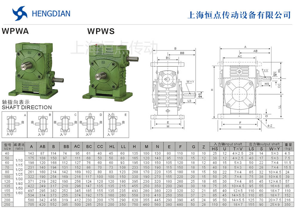 WPWA與WPWS系列萬能型蝸輪蝸桿減速機選型指南,WPWA與WPWS減速機軸輸入,軸輸出.WPWA與WPWS減速機的外形尺寸及安裝尺寸WPWA與WPWS減速機軸指向表示方法.機座號40到250,速比10到60.