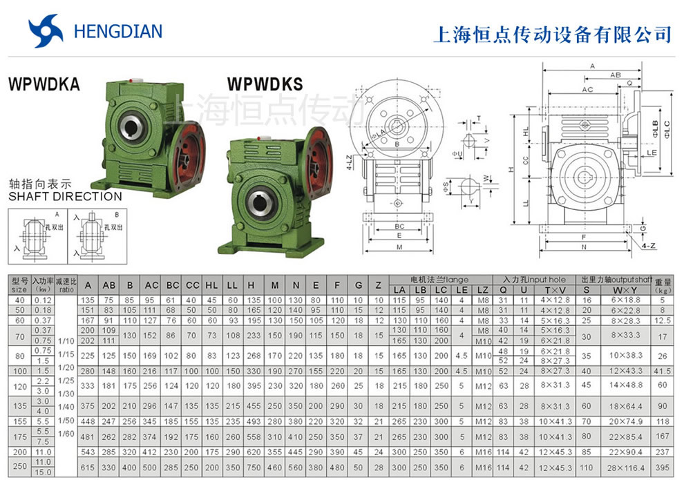 WPWDKA與WPWDKS系列萬(wàn)能型蝸輪蝸桿減速機(jī)選型指南,WPWDKA與WPWDKS型減速機(jī)軸指向表示方法.機(jī)座號(hào)40到250,速比10到60.WPWDKA與WPWDKS減速機(jī)的外形尺寸及安裝尺寸