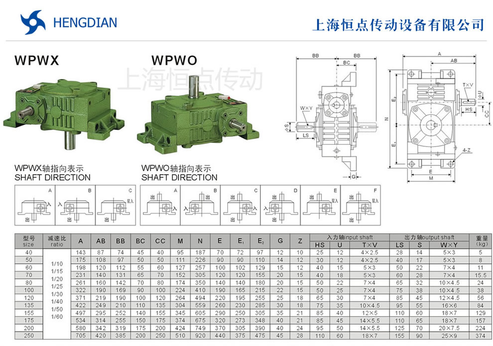 WPWX與WPWO系列萬能型蝸輪蝸桿減速機(jī)選型指南,WPWX與WPWO減速機(jī)軸輸入,軸輸出.機(jī)座號40到250,速比10到60.WPWX與WPWO萬能型減速機(jī)的外形尺寸及安裝尺寸